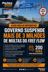 O governo federal anunciou nesta terça-feira (28) a suspensão de mais de 3 milhões de multas aplicadas no sistema de pedágio eletrônico Free Flow em todo o país. A medida prevê um prazo de 200 dias para que motoristas regularizem tarifas em aberto sem pagamento de multa e sem pontos na CNH.