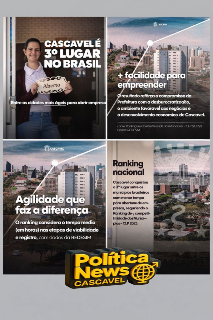 Cascavel voltou a se destacar no cenário nacional quando o assunto é agilidade e desenvolvimento econômico. De acordo com o Ranking de Competitividade dos Municípios – CLP 2025, a cidade aparece como a 3ª mais rápida do Brasil na abertura de empresas, reforçando o avanço nas políticas de desburocratização e modernização dos serviços públicos.