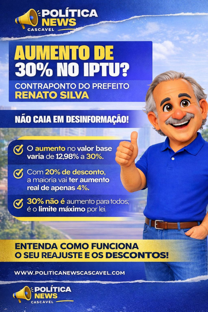 Após a repercussão sobre os carnês do IPTU 2026, o prefeito de Cascavel, Renato Silva, usou as redes sociais para esclarecer a população e rebater o que classificou como “desinformação” sobre o reajuste do imposto. Em uma sequência de publicações explicativas, o prefeito destacou que os 30% divulgados não representam aumento automático para todos os imóveis, mas sim um limite máximo legal de correção.