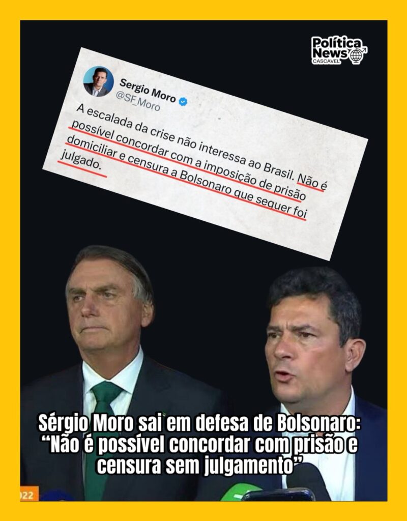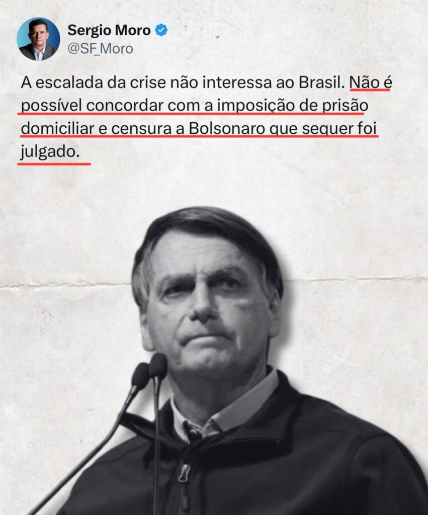 “A escalada da crise não interessa ao Brasil. Não é possível concordar com a imposição de prisão domiciliar e censura a Bolsonaro que sequer foi julgado”, afirmou Moro.